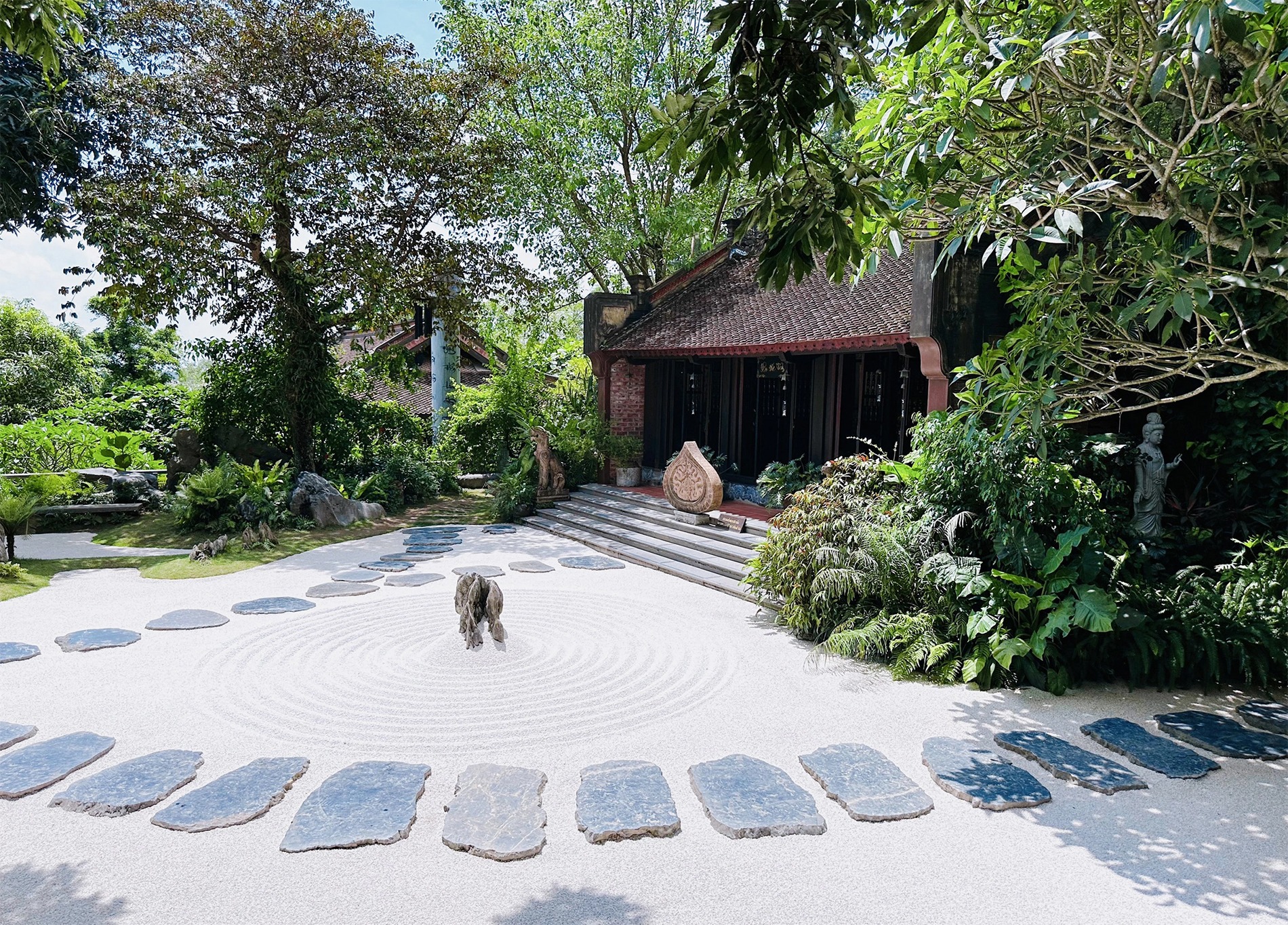 Bao quanh chùa là rừng thông xanh, vườn thiền, ao sen, khu vực thưởng trà. Chùa bố trí ghế, võng và phòng trà cho du khách thư giãn, ngắm cảnh.