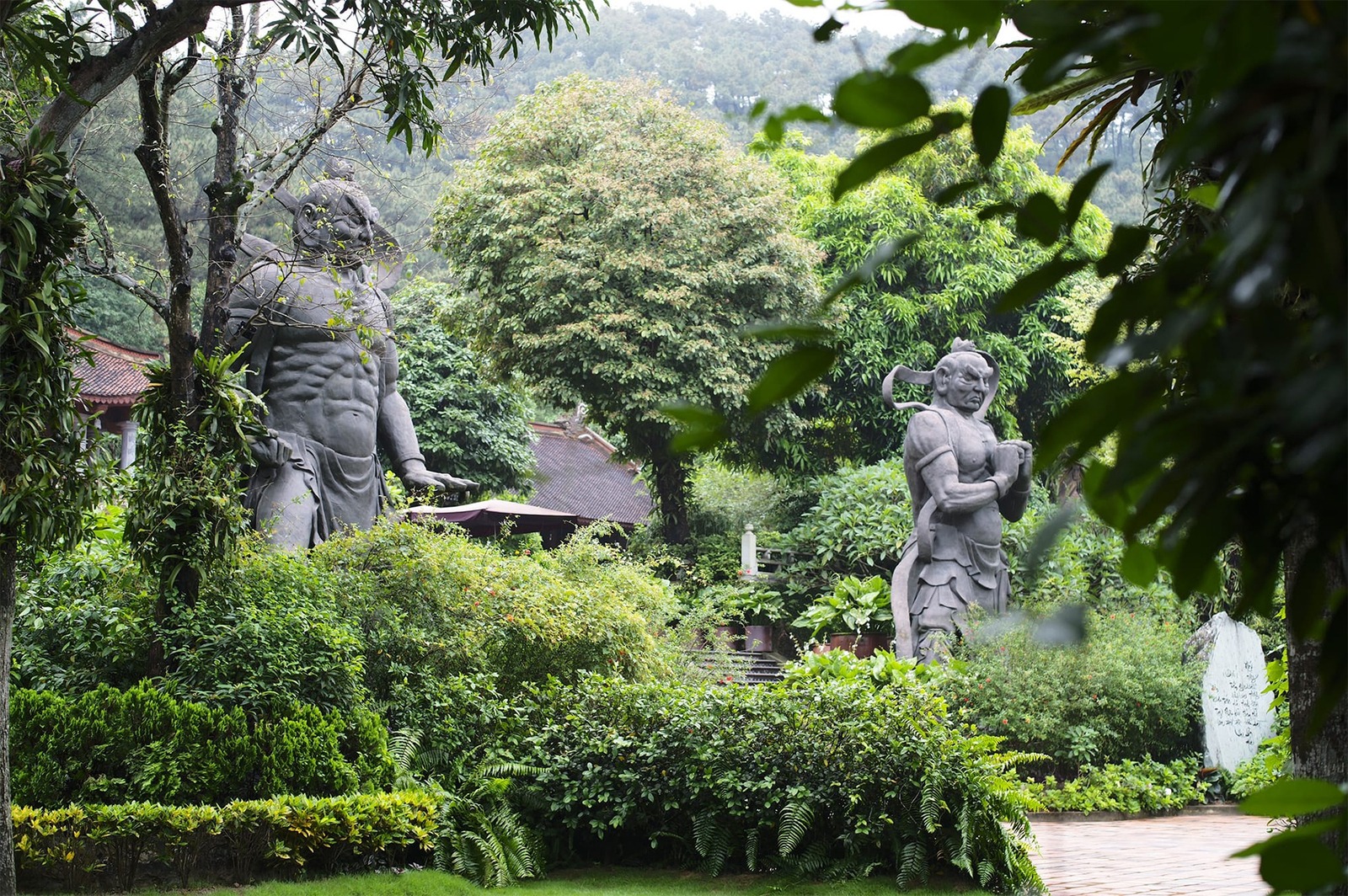 Bao quanh chùa là rừng thông xanh, vườn thiền, ao sen, khu vực thưởng trà. Chùa bố trí ghế, võng và phòng trà cho du khách thư giãn, ngắm cảnh.
