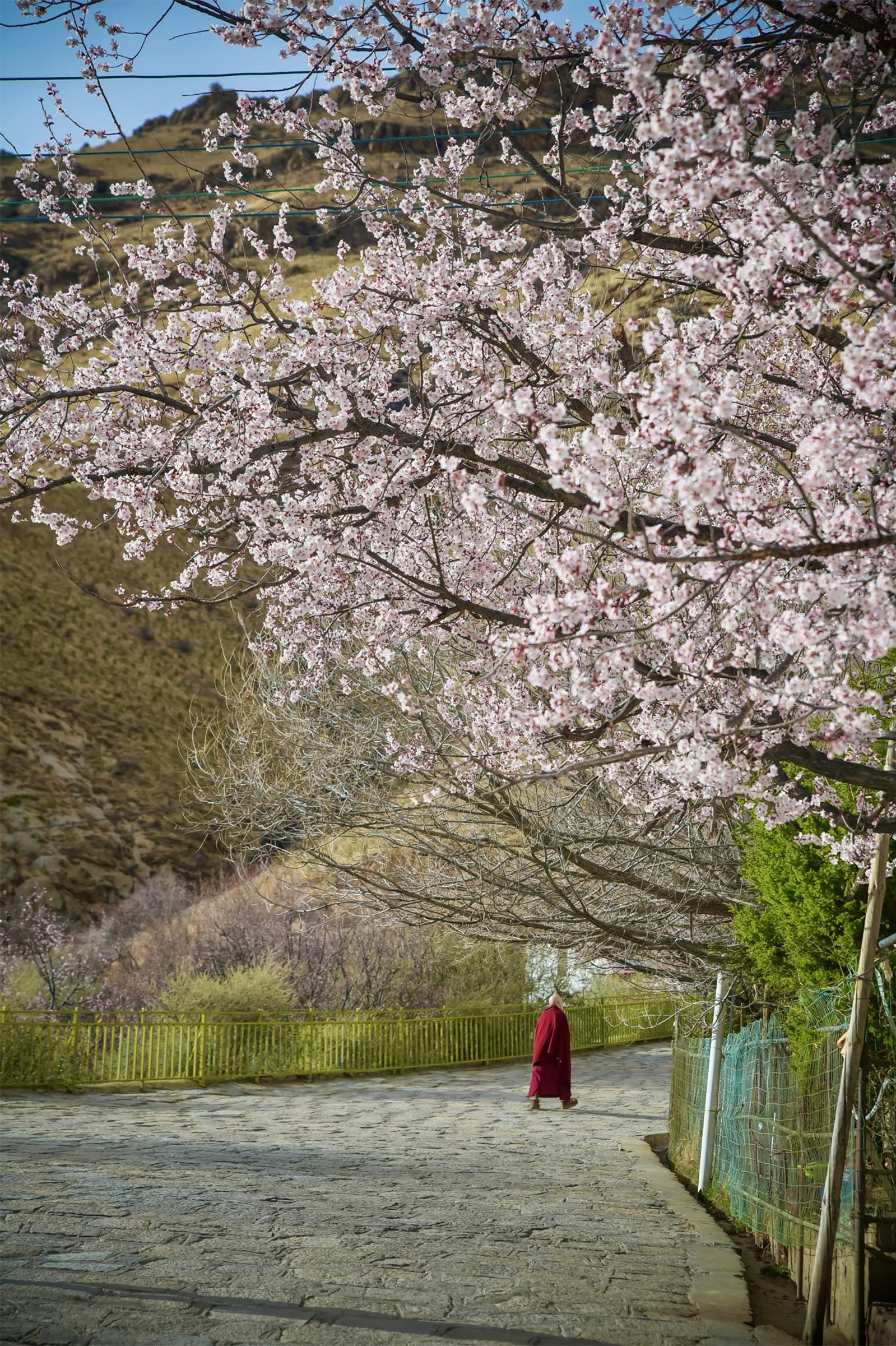 Tây Tạng đang là mùa xuân, nhiều loài hoa nở bung nở khắp nơi như anh đào, mơ, cải, trong đó, hoa anh đào nhiều và nổi bật nhất.